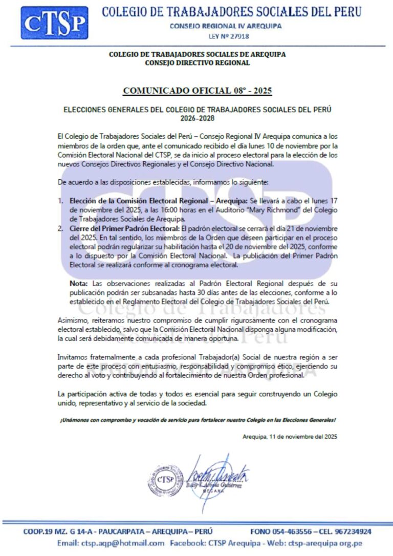 COMUNICADO OFICIAL 06º – 2025 COYUNTURA ACTUAL CTSP REGION IV AREQUIPA